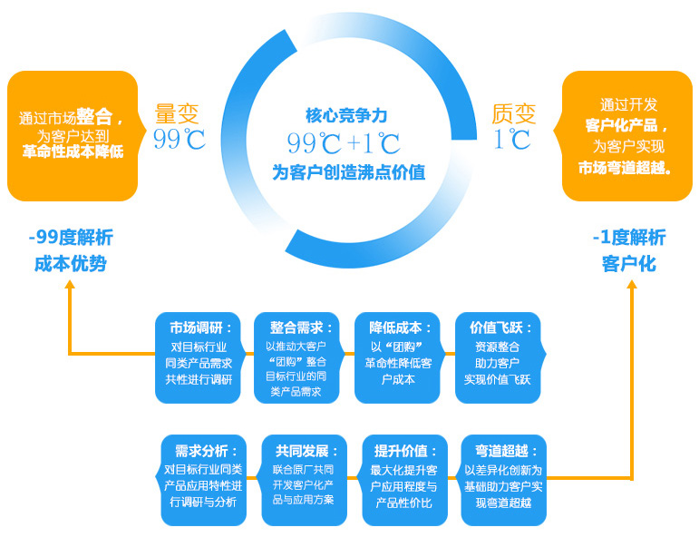 核心競爭力:以99℃+1℃為客戶(hù)創(chuàng )造沸點(diǎn)價(jià)值。99℃(量變):通過(guò)市場(chǎng)整合,為客戶(hù)達到革命性成本降低;1℃(質(zhì)變):通過(guò)開(kāi)發(fā)客戶(hù)化產(chǎn)品,為客戶(hù)實(shí)現市場(chǎng)彎道超越。